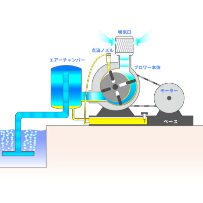 東浜のエアーポンプは、浄化槽、排水処理槽の曝気・重油、灯油バーナーの噴霧、鍍金槽の攪拌、水中のエアカーテン等、幅広く使用されています。